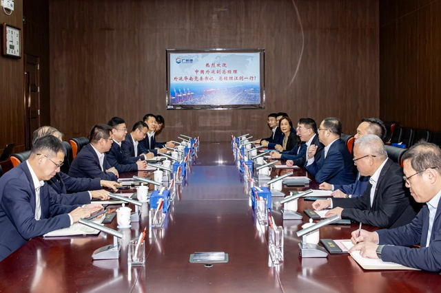 黄波对汪剑一行的来访表示热烈欢迎,介绍了广州港集团经营发展情况。他指出,近年来,广州港集团依托港口区位优势、资源优势、政策优势,加快建设世界一流强港,在保障华南地区产业链供应链安全稳定、服务经济社会高质量发展中发挥排头兵作用。当前,广州港集团正深入学习贯彻习近平总书记在第四次“一带一路”建设工作座谈会上的重要讲话精神,进一步做好通道带物流、物流带经贸、经贸带产业文章,推动共建“一带一路”倡议,将港口打造成为设施联通、贸易畅通的世界门户枢纽。中国外运作为新中国外贸运输和物流行业的开拓者,在改革发展中取得的成绩令人印象深刻,广州港集团与中国外运有着良好的合作基础,希望双方发挥港口枢纽优势和物流网络优势,强化资源共享,拓展合作路径,推动物流业降本提质增效,更好服务构建新发展格局。