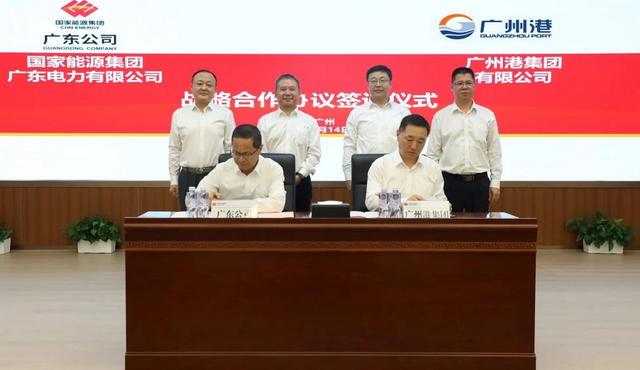 在广州港集团党委书记、董事长黄波和国家能源集团广东电力公司党委书记、董事长张翼见证下,广州港集团总经理吴超、国家能源集团广东电力公司总经理黄思林代表双方签署战略合作协议书。
