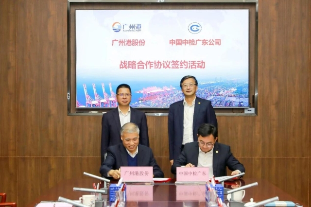 广州港股份党委副书记、总经理郑灵棠,党委委员、副总经理李明忠,副总经济师陈宏玉,中国中检广东公司党委书记、董事长、总经理苏立明,副总经理廖满生出席并见证签约。双方相关部门负责人参加活动。