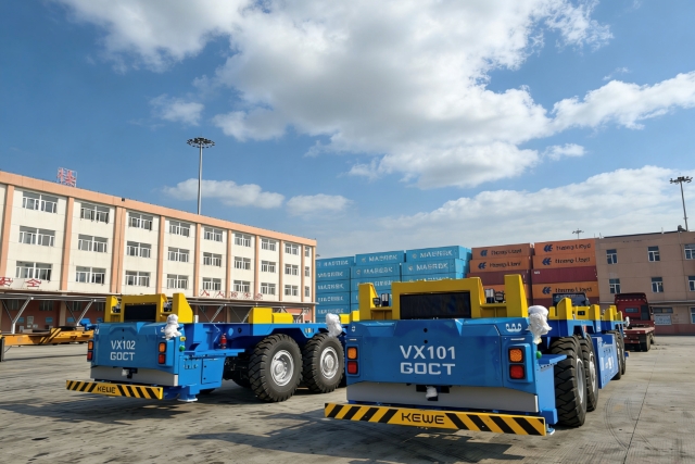 首批交付的无人驾驶水平运输车采用先进的四轴八轮双驱动设计,不仅能实现同向与逆向灵活转动,更大幅缩小了转弯半径,轻松应对码头内狭窄复杂的通行环境,可有效解决重载车辆在码头狭窄场地“转弯难”的痛点;在安全性能上,车辆配置多重防护系统:车身前后均搭载电子防撞激光雷达与机械防撞装置。车辆还搭载了四大“智慧引擎”,为码头高效作业提供强劲支撑: