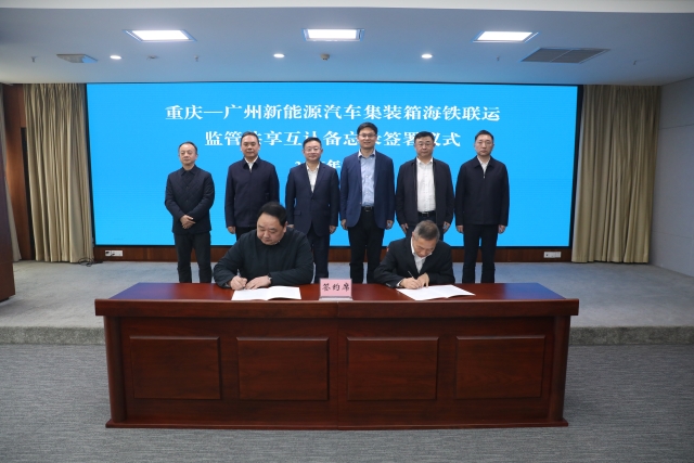 3月19日下午,渝穗两地海事监管互认座谈会暨备忘录签署仪式在重庆市政府口岸物流办举行。在广东省商务厅副厅长何军,重庆市政府口岸与物流办公室党组成员、副主任王善礼,广东海事局副局长刘浩,重庆海事局党委书记、局长胡远胜,广州港集团党委副书记、总经理吴超,长江海事局危管防污处处长吴玉峰等领导的见证下,广州海事局与重庆海事局代表共同签订《新能源汽车集装箱海铁联运监管共享互认备忘录》。